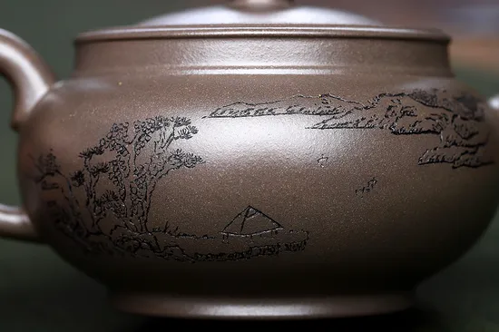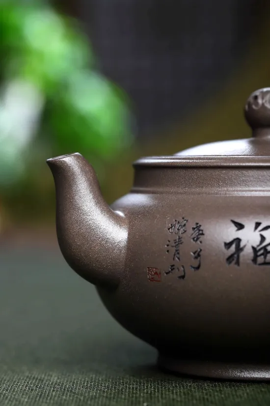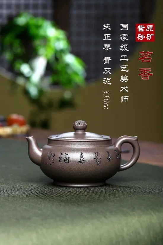 Artisan Wan Qing, a National Assistant Craft Artist, adorned the chinese yixing teapot with minimalist carvings. Using specialized engraving tools, she created dimensional patterns without compromising structural integrity. The elegantly inscribed "Tea Fragrance" calligraphy harmonizes with the teapot's contours.