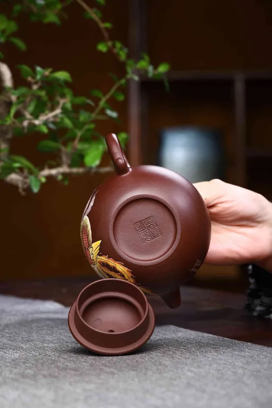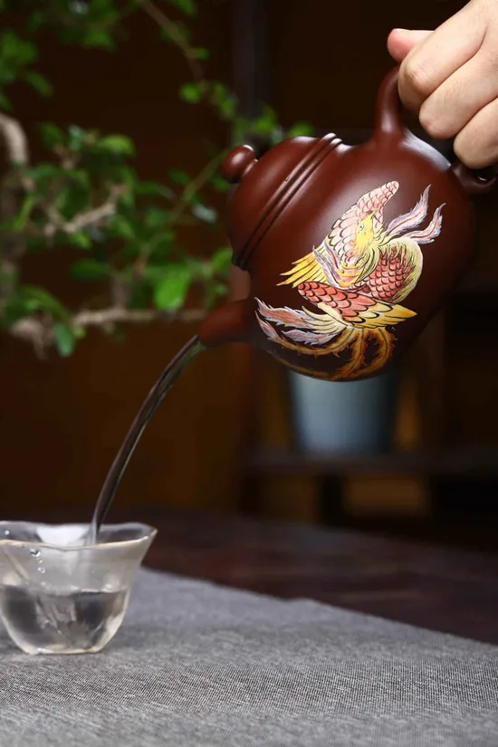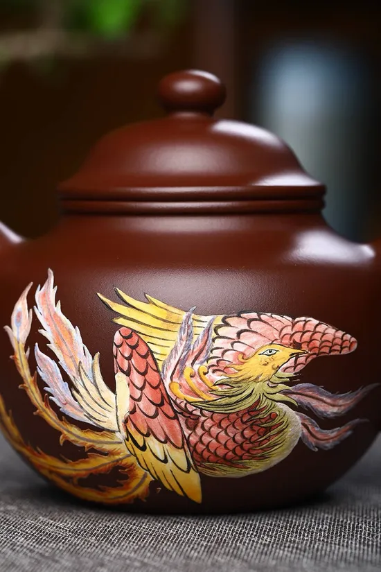 Artisans employed fully manual clay painting techniques to depict soaring phoenixes using differently colored zisha clays. Feather details appear vividly textured, with tail plumes seemingly fluttering in wind currents. This delicate decoration demands extreme precision, as semi-dried clay easily distorts during painting.