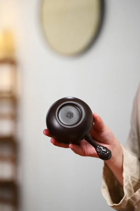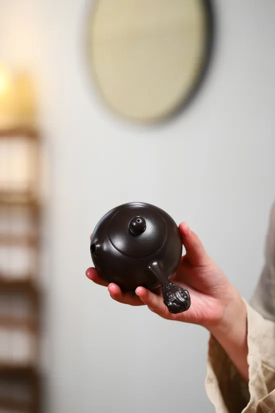 This handmade Yixing teapot employs exceptionally rare clay material identical to that used by master Gu Jingzhou. Sourced from specific veins in Yixing, Jiangsu during the 1960s, this "Black Duntou" clay underwent decades of natural aging. The oxidized metallic minerals within create distinctive dark brown hues after firing, while enhancing tea aroma retention and developing smooth patina through prolonged use.