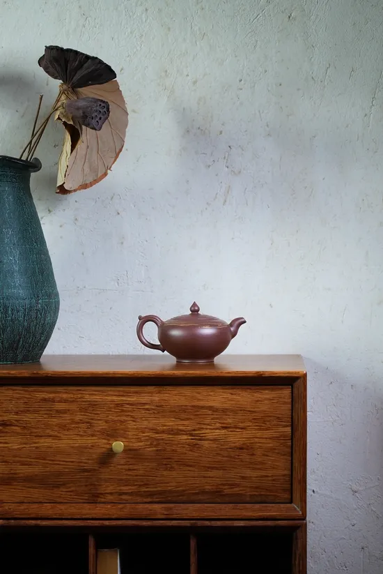 This teapot named "Water Droplet" is a Yixing teapot created by Chinese ceramic artist Wang Zhenghong from Yixing. As a national-level craft artist, Wang used aged raw zisha clay to create this 250-milliliter tea set. The purple clay teapot features a full, rounded shape resembling gently rippling water in a spring pond.
