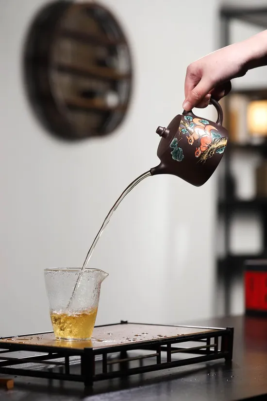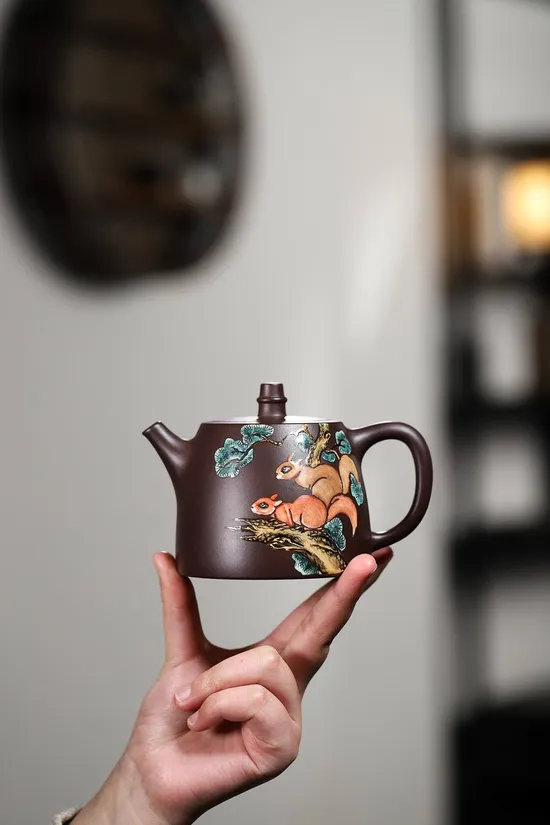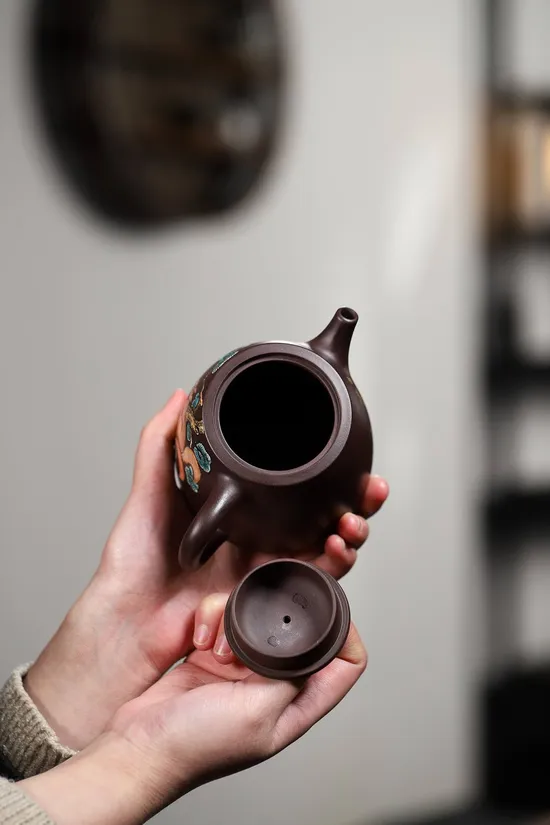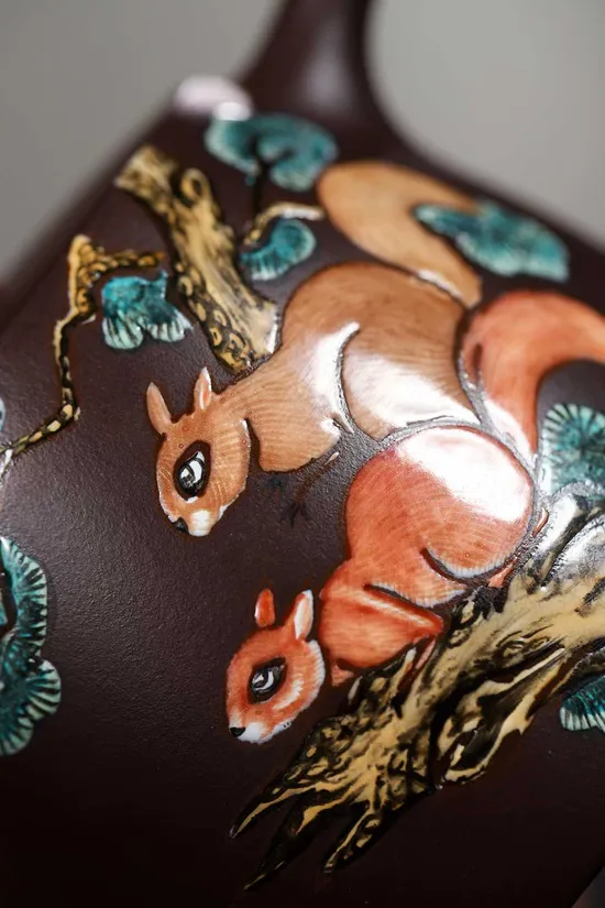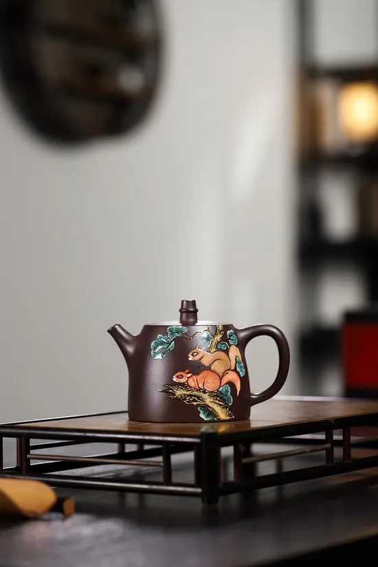 The most striking feature lies in the exquisite enamel paintings adorning the teapot's body. Artisans used natural mineral pigments to create four vibrant colors: ruby red, peacock blue, turquoise, and topaz yellow, each requiring separate kiln firing. Final gold powder outlines make the entire purple clay teapot shimmer under light, with complex processes ensuring permanent colorfastness.