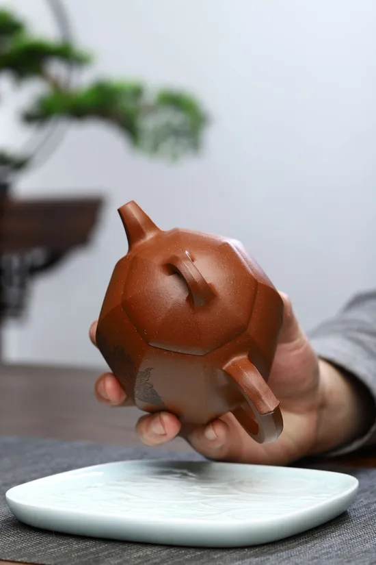 The hexagonal Qin Quan teapot showcases unique structural design. Its body adopts a six-sided prism configuration, with each plane meticulously calculated. This design originates from ancient bronze vessel concepts, featuring clean, powerful lines and crisp angular transitions. The lid fits seamlessly with the mouth, enabling precise water flow control during pouring. The ergonomic handle ensures both stability and comfort during use.