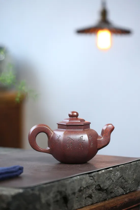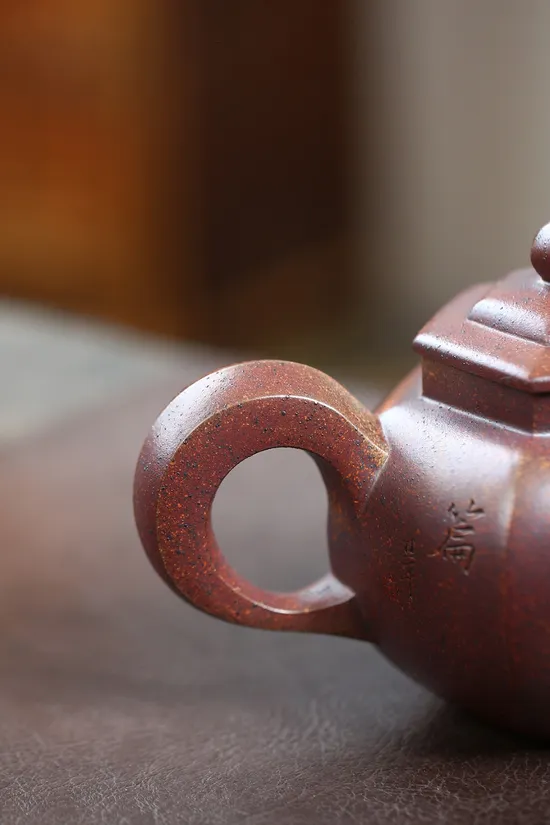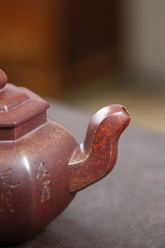 Featuring a hexagonal structure with crisp linear aesthetics, this Chinese zisha teapot demonstrates meticulous craftsmanship. The spout, knob, and handle all incorporate six-sided geometries that harmoniously interact. Precise alignment creates a straight visual axis connecting the handle's apex, knob center, and spout tip. The flawless lid fitment ensures drip-free pouring - a testament to expert engineering.