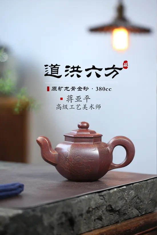 $342.86Artisan Jiang Yaping's hexagonal Zisha teapot, made with Dragon Bone clay, features precision engineering and classical engravings. 80cc capacity with optimal pour control.